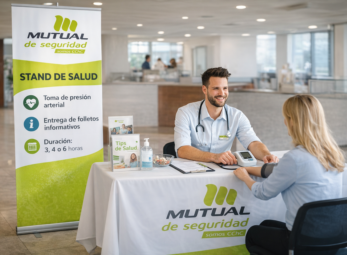 Instalación de un stand nutricional en la empresa, atendido por un nutricionista, donde los trabajadores pueden realizar mediciones básicas (peso, talla y cintura), recibir evaluación de IMC, recomendaciones de hábitos saludables y material informativo.